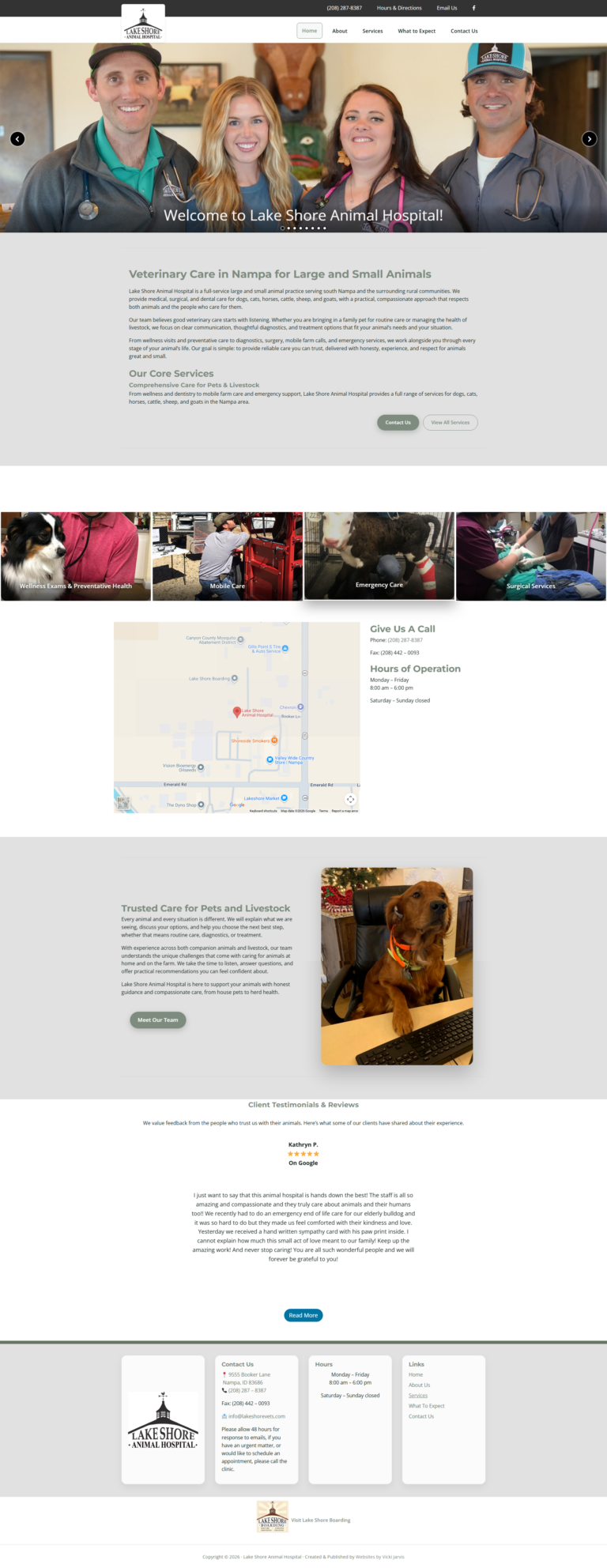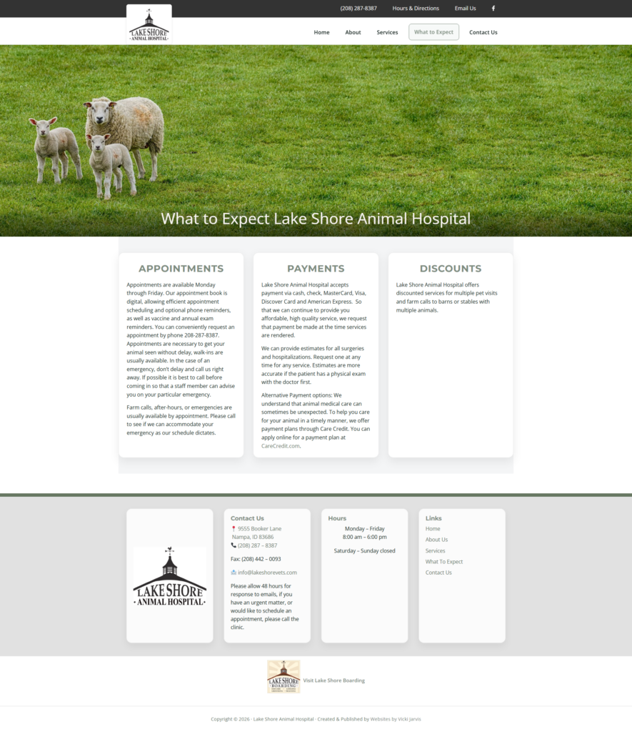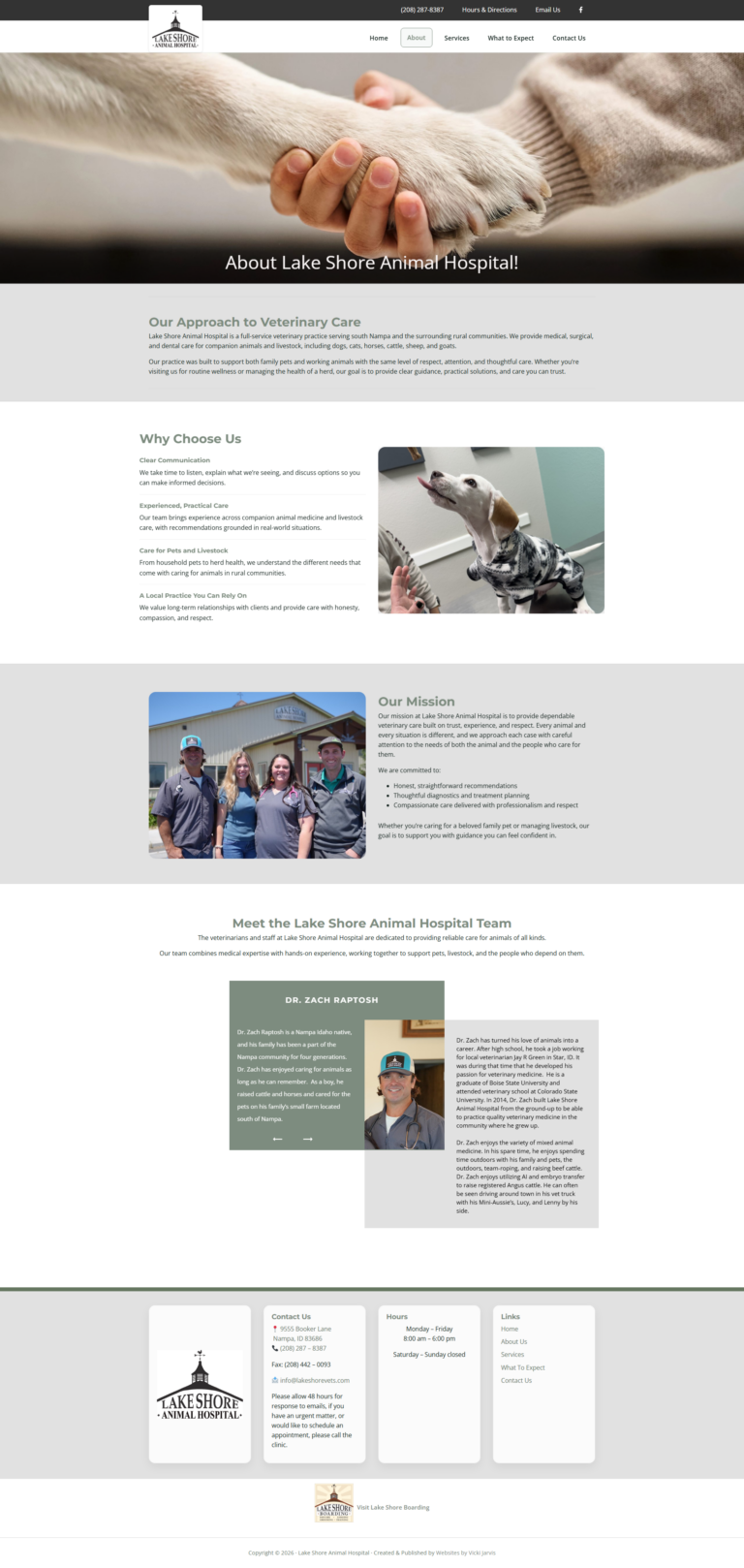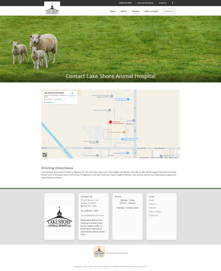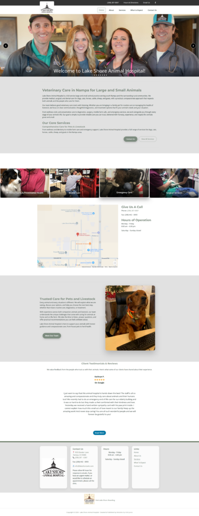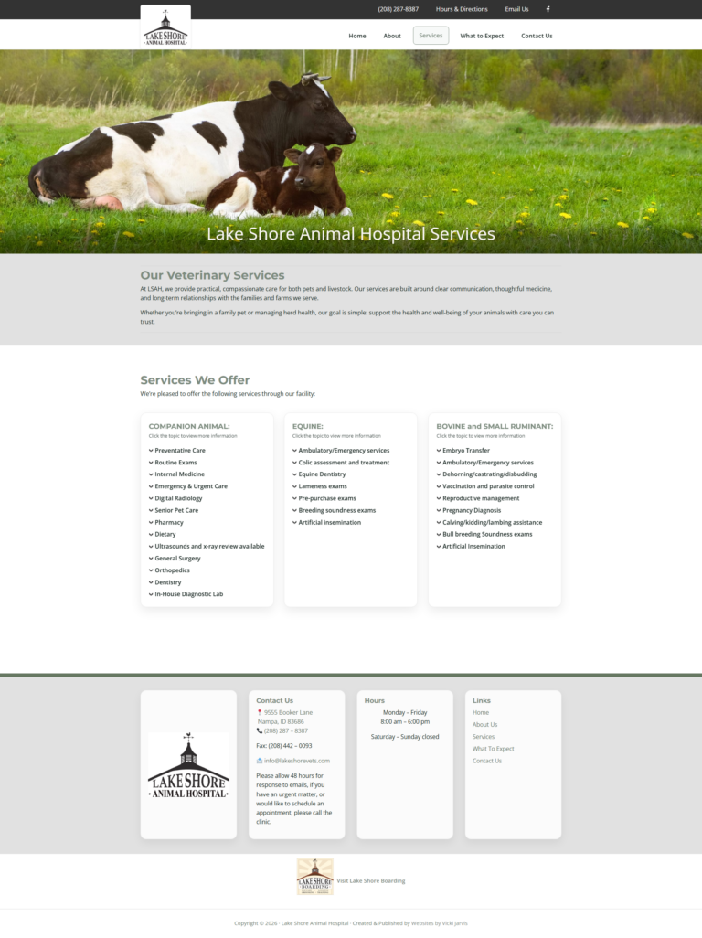 Lakeshore Animal Hospital needed a website redesign that better reflected the practice’s values while supporting the daily needs of both pet owners and livestock clients. The existing site required updates to improve usability, accessibility, and content organization, as well as ongoing maintenance to keep information accurate and reliable.